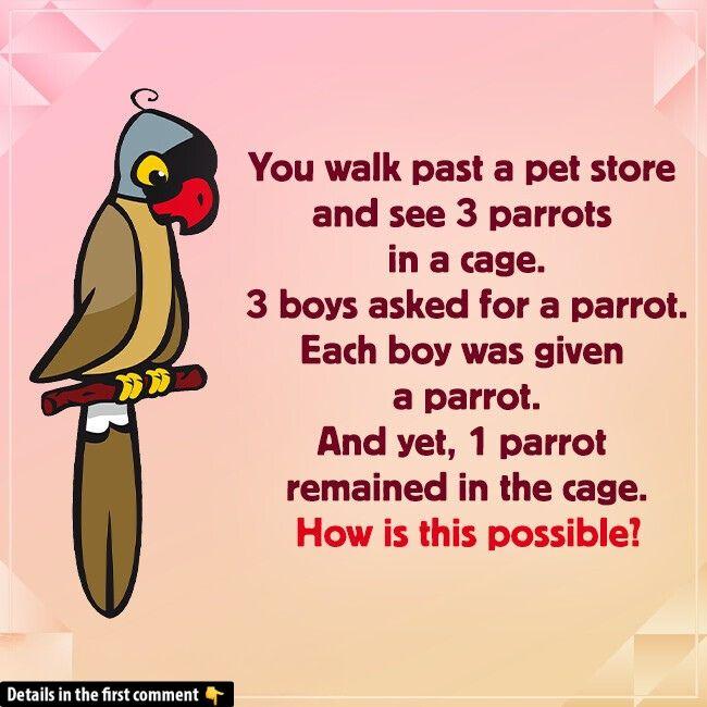 In this classic puzzle, three boys are involved in a parrot exchange. According to the story, each boy is given one parrot. However, despite giving away all three parrots, there’s a surprising outcome: one parrot is still “in the cage.”