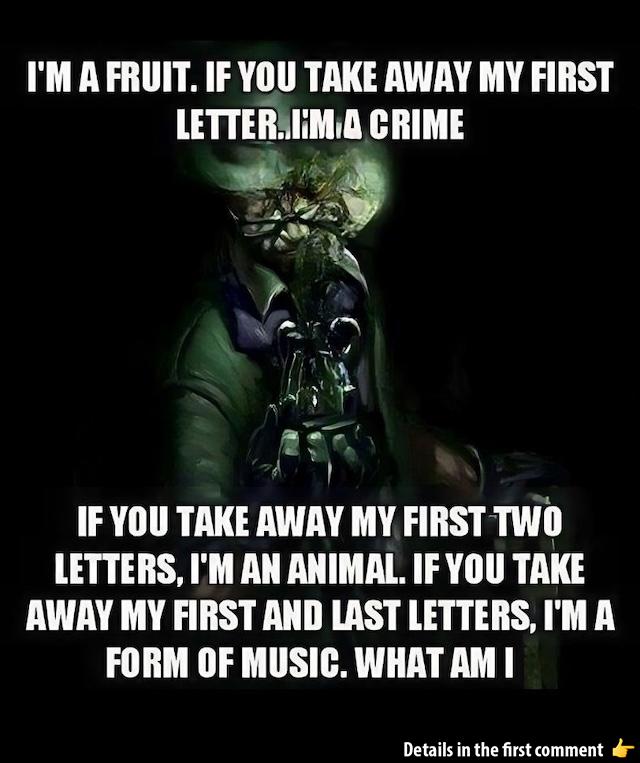 “I’m a fruit. If you take away my first letter, I’m a criminal. If you take away my first two letters, I’m an animal. If you take away my first and last letters, I’m a form of music. What am I?”