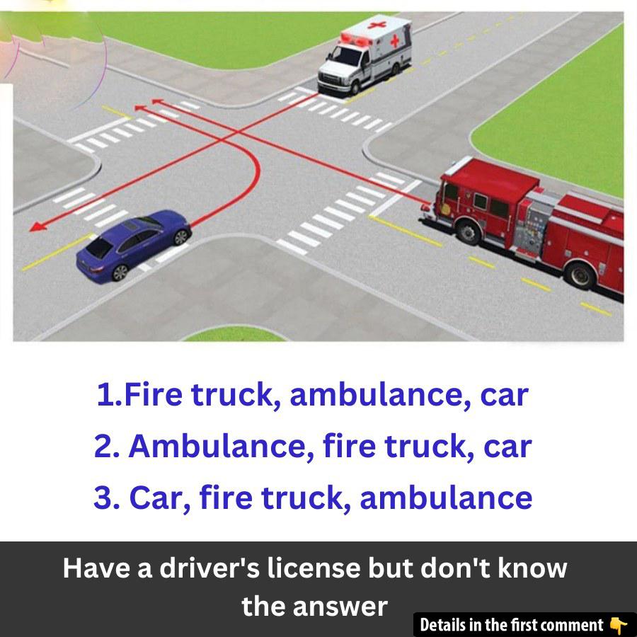 Have you ever wondered which vehicle takes priority at an intersection? Try this fun challenge and see if you know the answer! With a fire truck, ambulance, and regular car all stuck at an intersection, who should move first? This is not just about the loudest siren – there’s a specific order! Test your knowledge, think carefully, and share your answer in the comments. Let’s see who really understands priority rules on the road! Can you solve it? Give it a try now!